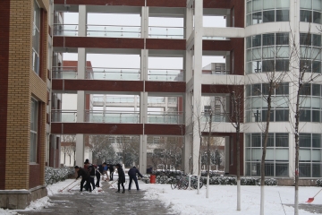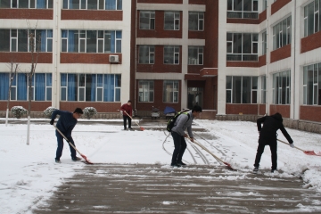 2月21日夜,我市突降大雪,给师生员工出行造成不便。化学化工学院立即启动特殊天气应急预案,安排师生按照责任区域展开清雪工作。参与清雪的教职工及学生不怕苦、不怕累、顶风冒雪、共同协作,完成了责任区内的清雪工作。22日清晨,威廉希尔官网师生提前取来清雪工具,有序地来到各自的劳动区域,开始清雪工作。面对厚厚的冰面,老师和同学们充分发扬了吃苦耐劳、顽强拼搏的精神,大家团结协作,干劲十足,分工明确,极大的提高了工作效率。在威廉希尔官网师生共同努力下,威廉希尔官网8教、9教、10教周边道路及楼间广场厚厚的积雪基本清理干净,确保了校园道路的畅通无阻,为师生安全出行提供了保障。