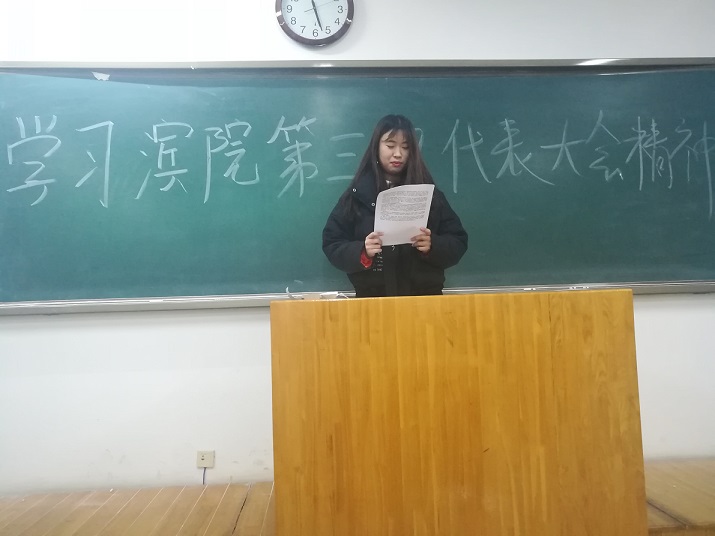 此次班会形式多种多样,有的班级通过主题演讲的形式,阐述了大会精神;有的班级采用问答形式,让同学们更好的理解大会核心和主要内容;部分班级则通过现场模拟的方式,更加直观地向同学们展现大会过程;还有少数班级通过自由发表意见的形式,号召全班同学积极行动起来,为共建和谐滨院贡献自己的一份力量。班会后,同学们纷纷表示以后一定提高集体为主、个人为辅的思想意识,积极参加各项活动,将身心投入到滨院建设中去,传承和发扬团结奋进、积极进取的精神。