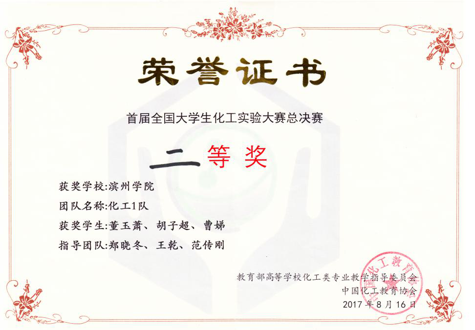 滨州学院化学工程与工艺专业2006年开始招生,是滨州学院特色专业之一。2011年化学工程与工艺专业教学团队获批为省级教学团队,2013年获山东省首批“卓越工程师教育培养计划”试点专业,2014年获山东省应用型人才培养专业发展支持计划专业,2016年获山东省对口贯通分段培养试点专业,2016年获山东省高水平应用型大学重点专业群建设核心专业。本专业拥有省级教学名师2人,校级教学名师2人,教学成果显著,建有6门省级精品课程,获山东省教学成果一等奖 1 项,出版专著(教材)8 部。学生获得各类全国、省级化工设计竞赛一等奖、二等奖50余项,获省级优秀学士学位论文3篇。