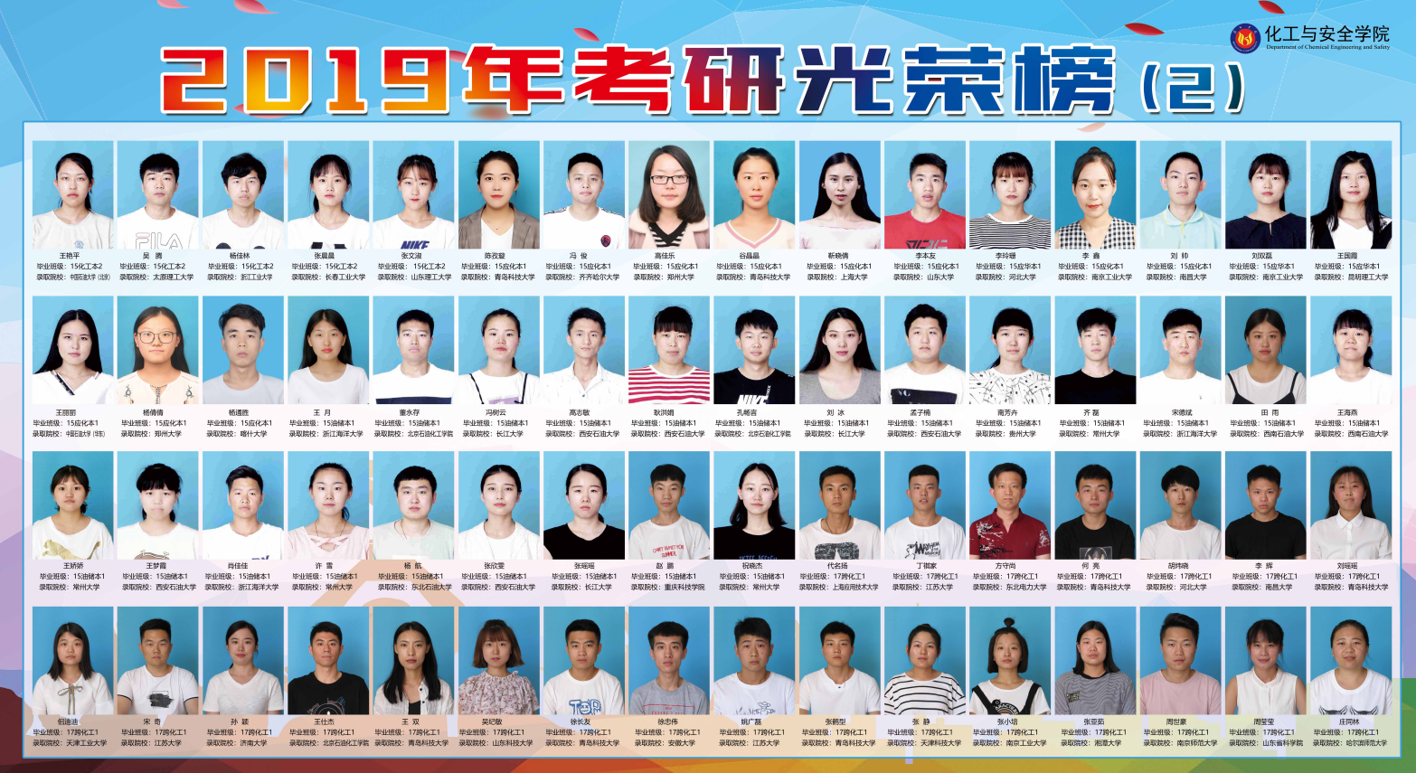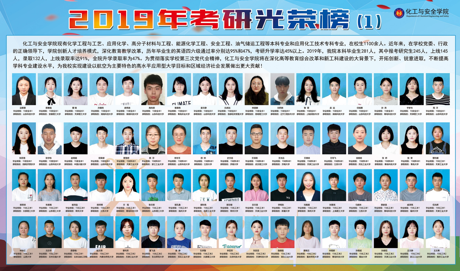 近日,2019全国研究生招生录取工作结束,威廉希尔官网成绩喜人。威廉希尔官网19届本科毕业生281人,其中报考研究生245人,上线145人,录取132人,上线录取率达91%,全院升学录取率为47%。近年来,化工与安全学院不断深化高等教育综合改革和新工科建设,开拓创新、锐意进取,不断提高学科专业建设水平,为威廉希尔官网实现建设以航空为主要特色的高水平应用型大学目标和省内一流,国内知名的化工与安全学院做出更大贡献!