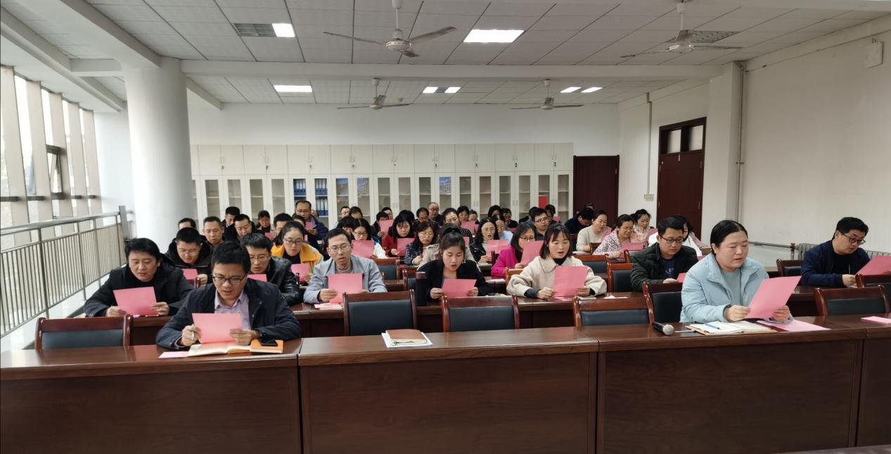 活动开始党总支副书记贾丽带领全体教工领唱了电影《第一书记》的主题歌《做人》、诵读了廉洁诗词《书端州郡齐壁》和《咏史》。