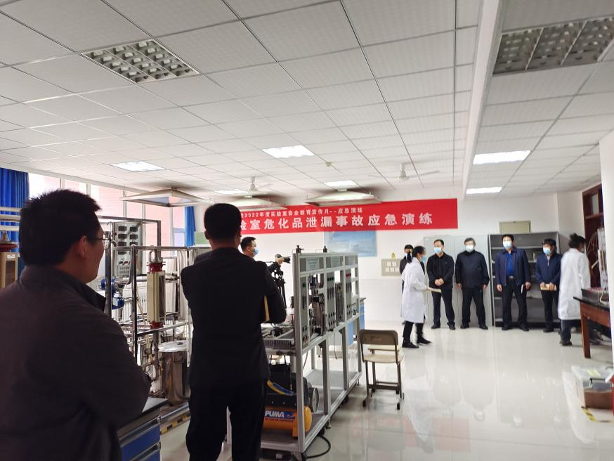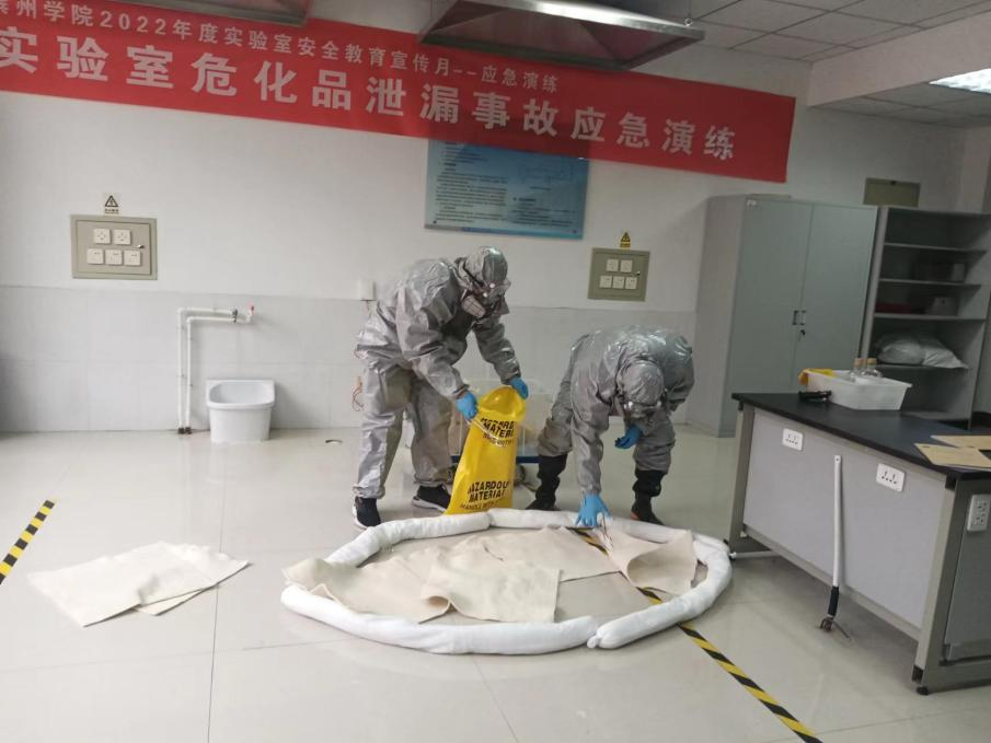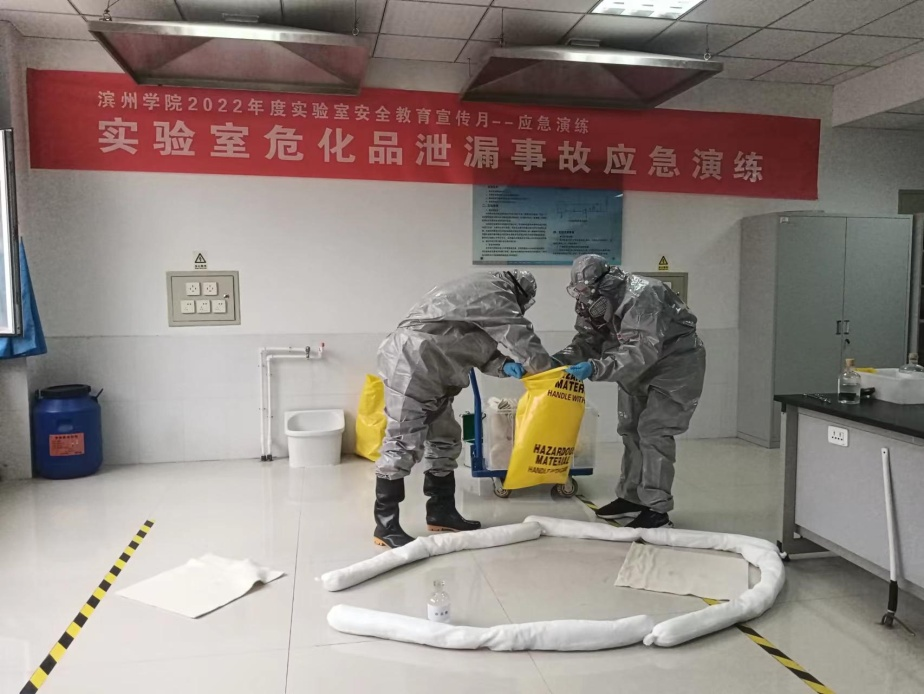 为加强师生实验室安全意识,提高师生应急处置能力,10月27日下午,滨州学院实验室危险化学品泄漏事故应急演练在化工基础实验室举行。校党委委员、副校长郭新伟,生物与环境工程学院党总支书记左之涛,化工与安全学院党总支书记王建、院长杨仲年、副院长商希礼,教务处副处长李建庆及实验室管理科全体人员、各相关学院的实验室管理人员观摩了演练,化工与安全学院承办。