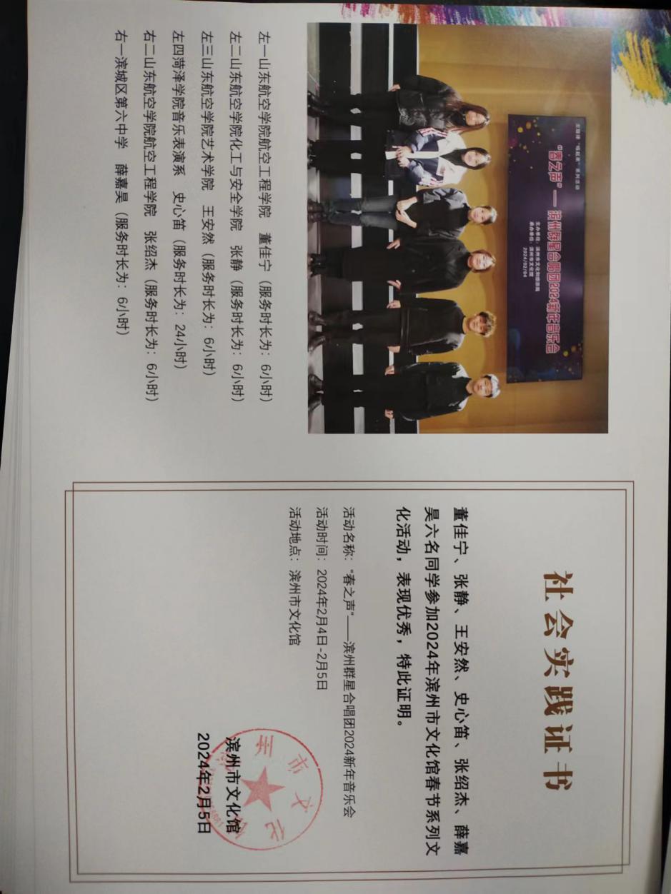 实践心得:在2024年初,我非常荣幸参加了由滨州市文化馆举办的“春之声"--滨州群星合唱团2024新年音乐会这一志愿活动,此次活动非常有意义。在本次志愿活动中,我了解到了滨州声乐文化的魅力,同时,也提高了自己的沟通能力和应变能力,学会了如何更好地与他人合作,共同完成任务。希望未来自己继续加油,在实践活动中能更好地锻炼自己、服务社会。