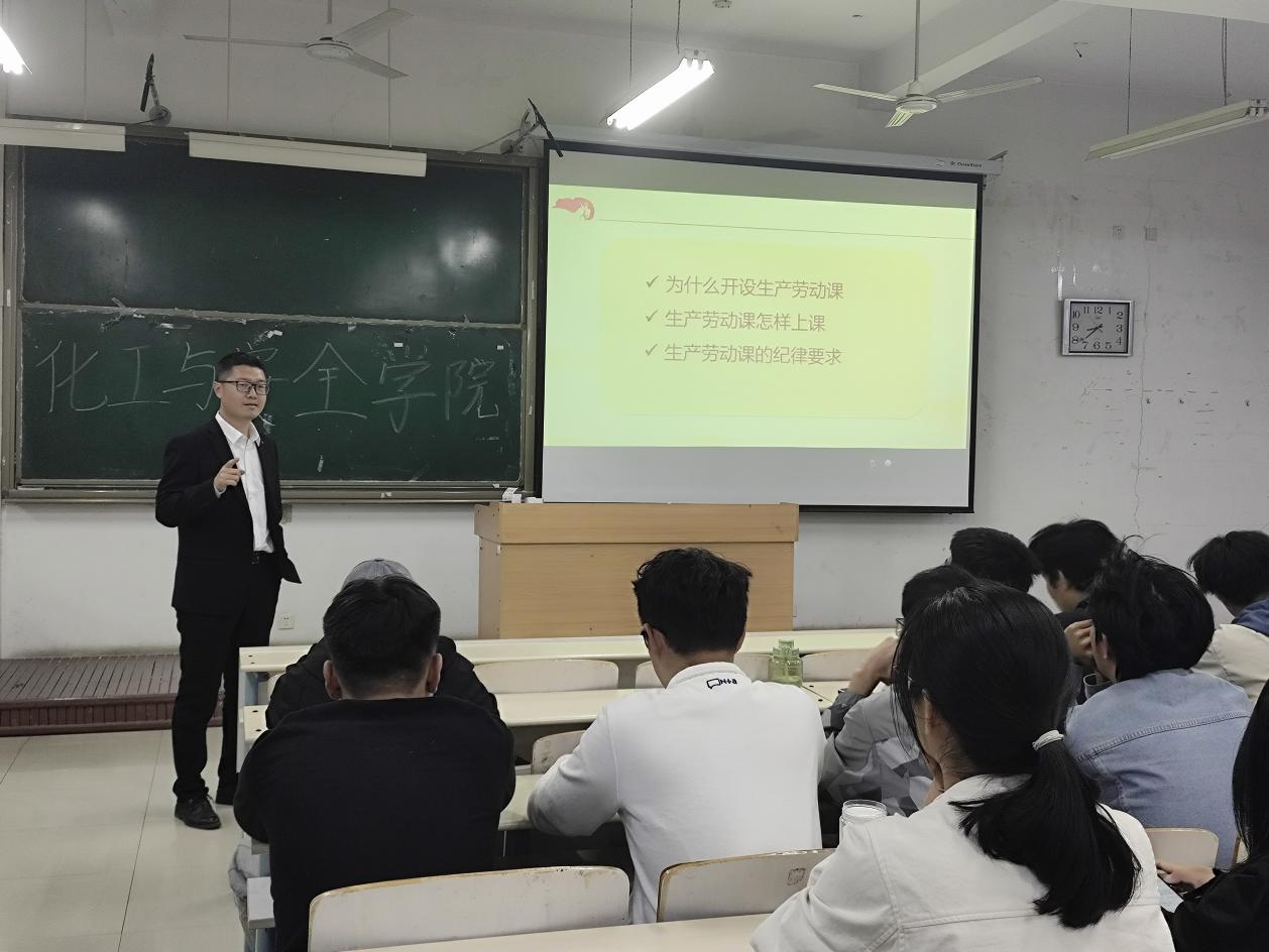 张岩冲通过PPT向同学们解答了“为什么开设生产劳动课”、“生产劳动课怎样上课”和“生产劳动课的纪律要求”等三个问题。带领同学们共同学习了中共中央、国务院于2020年3月20日印发的《关于全面加强新时代大中小学劳动教育的意见》和2020年7月7日教育部印发的《大中小学劳动教育指导纲要(试行)》两个文件,向同学们讲解了“校内实践管理办法”和“校内实践考核办法”的相关内容和要求,介绍了生产劳动课的岗位分配和岗位职责。