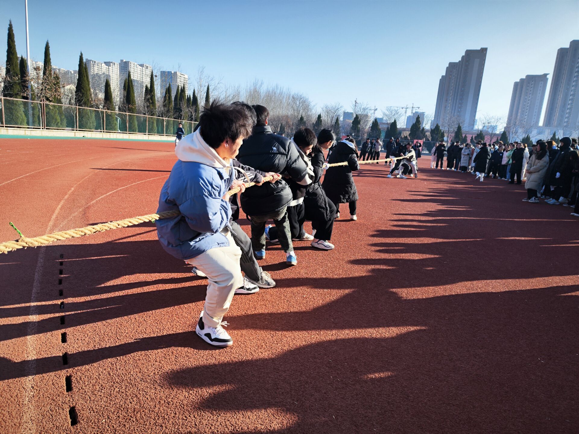 当粗绳绷紧,力量在两端汇聚,一场激烈的拔河比赛正式拉开帷幕。尽管冬风凛冽,但拔河赛场上的火热氛围却丝毫未减。本次拔河比赛共设两轮,采用淘汰赛制,每轮比赛三局两胜。每单次拔河结束后,双方队伍还会易边再战,确保比赛的公平性和趣味性。随着活动负责人的一声令下,比赛正式开始。双方同学们咬紧牙关,紧握长绳,全力以赴地为自己的班级争取胜利。参赛同学们紧绷的肌肉和挥洒的汗水无不洋溢着青春的气息,而场外的同学们则为他们加油助威,热情洋溢,整个赛场充满了团结和奋斗的氛围。