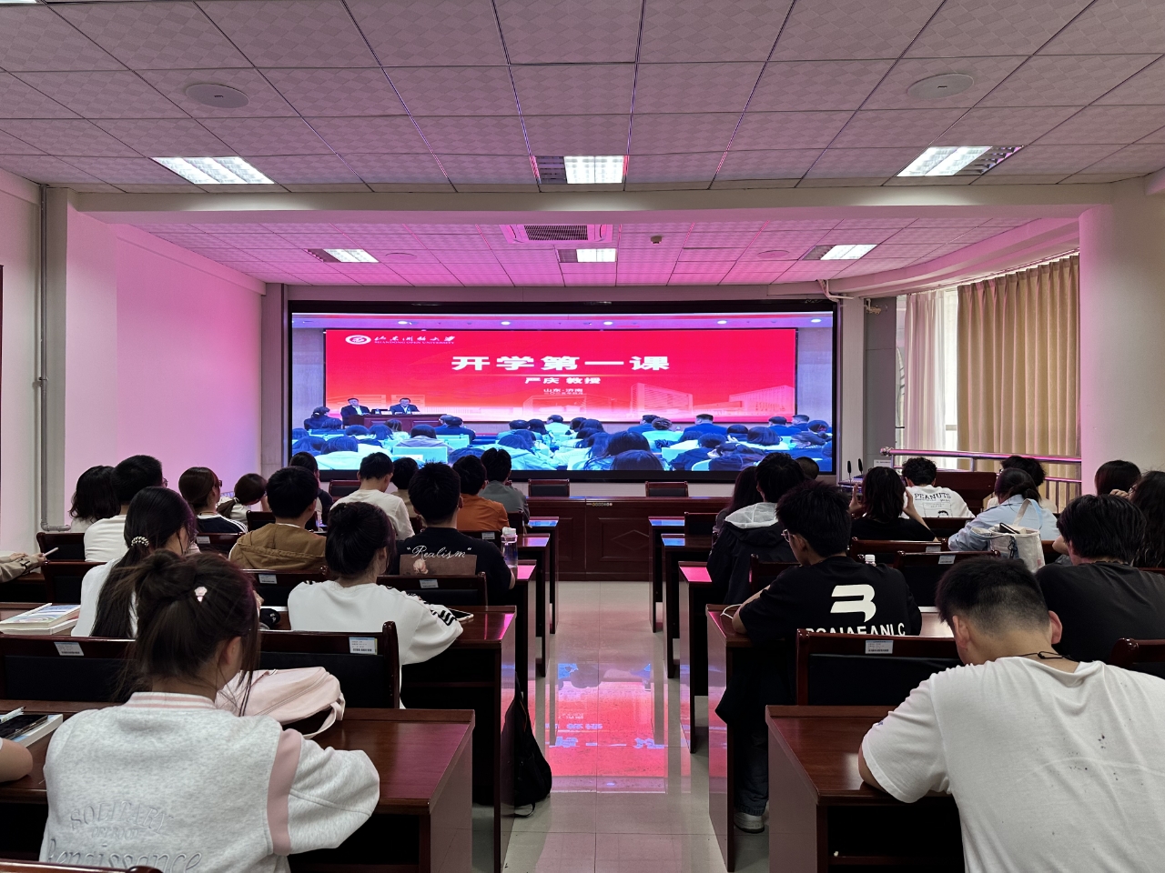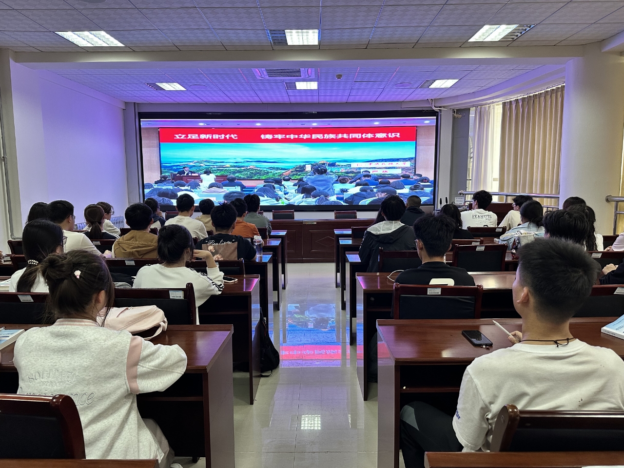 为深入贯彻习近平总书记关于加强和改进民族工作的重要思想,4月11日下午威廉希尔官网副院长商希礼,辅导员张岩冲、姚斌及少数民族学生代表等近百人,通过线上平台在九教313集中观看了由中央民族大学严庆教授主讲的《立足新时代铸牢中华民族共同体意识》直播课。此次活动旨在引导青年学子深刻理解中华民族共同体意识的时代内涵,践行“中华民族一家亲”的青春使命。