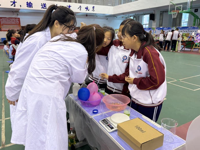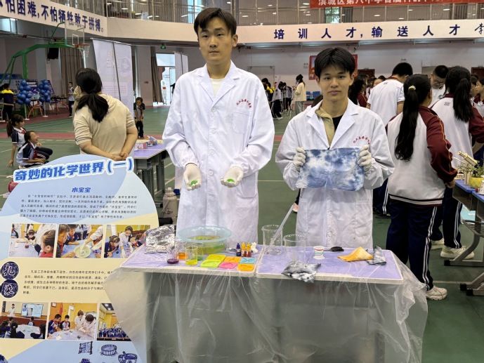 活动现场,“学海领航”团队精心设计“奇妙的化学世界”主题展区,将总书记提出的“科技创新与科学普及两翼齐飞”理念转化为生动实践。在“水宝宝扎染”实验区,学生们通过海藻酸钠与乳酸钙的离子反应,感受物质变化的奇妙;“熔岩灯”实验中,液体翻滚如岩浆涌动,直观展现密度与对流原理;神秘的“鲁米诺试验”在黑暗中绽放蓝光,激发对刑侦科学的探索热情。同学们分组协作、记录数据、踊跃提问,在实践中锤炼科学思维,培养了严谨求实、追求真理的科研品格。